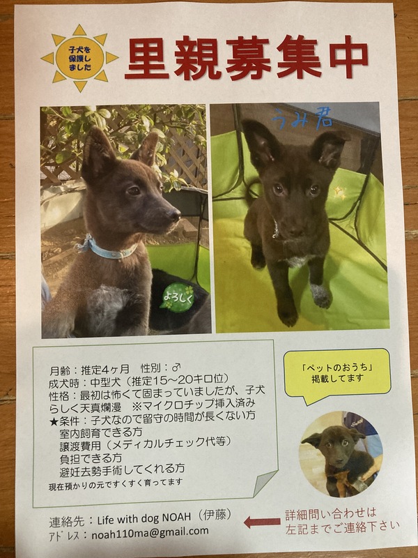| 里親募集する理由 | 子犬の捕獲が後を絶たず、センターがいっぱいでこの子たちは 入れなかったため、引き出しました。 かわいい盛りです。 どうか、家族に迎えて下さい。 ☆3回目のワクチン、終了しました。お散歩練習もスタートしています。 |