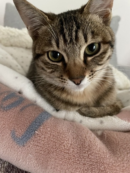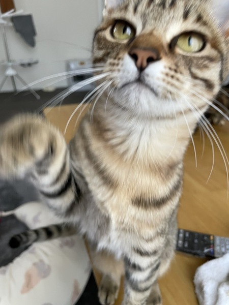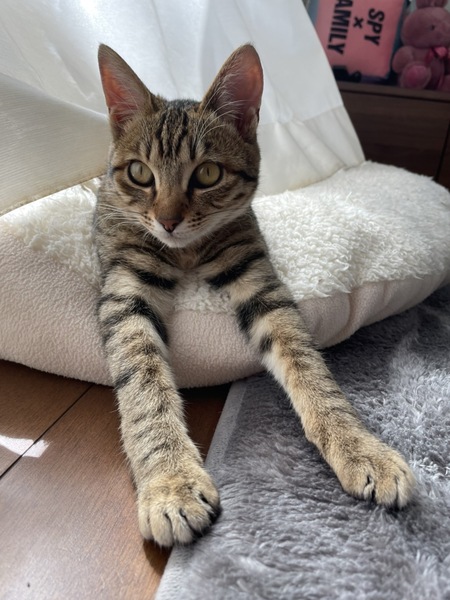 | 特徴(性格など) | 大きさは子猫と成猫の間くらいです。 元気すぎて家の中を走り回っています 昼間はよく寝てご飯は食べ足りないくらい食べます。 |