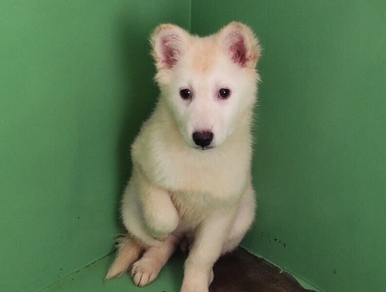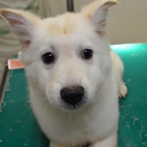 | 特徴(性格など) | 白い毛並み女のコ お耳の辺りに少しクリーム色が出てきました 毛が長いため、ふわふわの手触りです 人見知りがあるため慣れるまで少し時間がかかりますが、大人しく現時点では吠えも少ない子です 10kg前後の中型サイズ予想 |