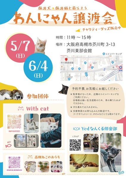 | その他(譲渡条件など) | コナちゃんの様子はYcdなんくる倶楽部ブログで紹介していますhttp://ycdclub.blog.fc2.com/ コナちゃんの様子はYcdなんくる倶楽部ブログで紹介していますhttp://ycdclub.blog.fc2.com/ コナちゃんは5/7の高槻市 芥川東部会館でのわんにゃん譲渡会に参加します。予約は不要ですが、気になるかたはこのサイトやブログ、SNSなどから連絡いただいたうえで来ていただけると話が早いです。 この会場は犬を連れて入れませんので、先住犬との相性を見たいかたは事前に連絡いただければ近くの公園に場所を移して会っていただけます。 個別お見合いもできますので、日程が合わない方はご連絡ください。 里親決定は先着順ではありません お見合いの後、トライアルに進む場合はご自宅にお届けしてトライアル開始となります。トライアル期間は2週間程度。その後正式譲渡となります。 |