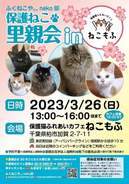 | その他(譲渡条件など) | 先住猫ちゃんの性格にもよると思いますが先住猫ちゃんのいらっしゃるお家でも問題ないと思います。 ひとり飼いの場合はお留守番の短いお家の方が良いです。 また猫を初めて飼うと言うお家にも向いていると思います。 脱走防止の徹底、お散歩は絶対にさせないでください。生涯大事にしてくださる約束をお願いします。 3月26日に柏市の猫カフェさんで開催される譲渡会に参加しますので、気になりましたら、 アビイに会いにきてくださると嬉しいです。 |