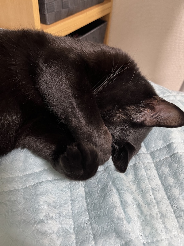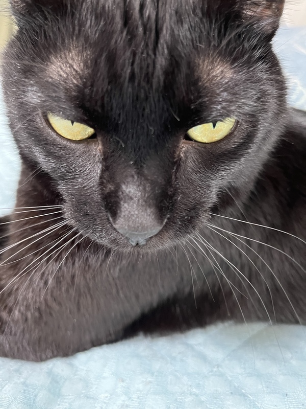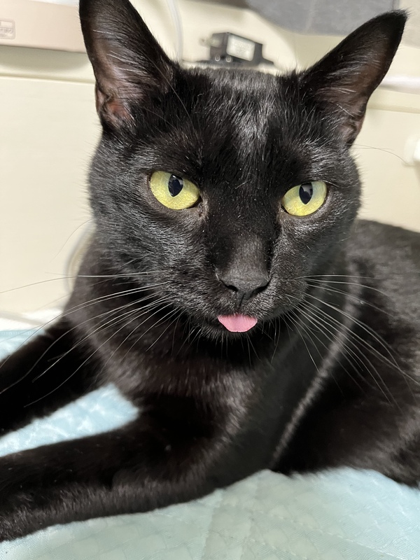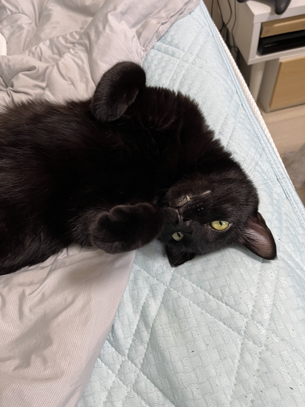 | 特徴(性格など) | 黒猫、金色の瞳、甘えん坊、頭や顔を色々な所に擦り付ける癖があり頭が少しハゲてかわいいです、色々な表情を見せてくれます、パタッと倒れて撫でてと甘える癖あり、壁や床に爪研ぎしません | ||
