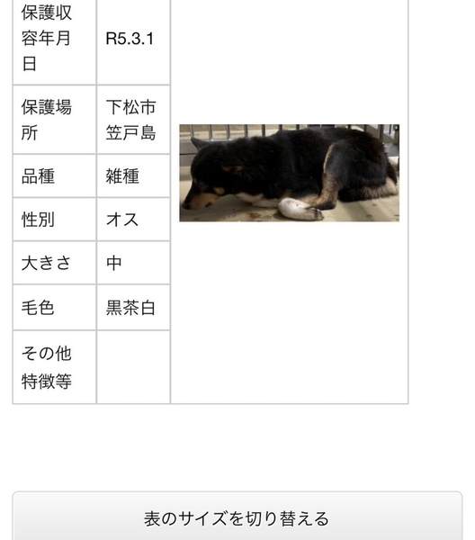 | 特徴(性格など) | 黒茶白、小さめの男の子です 体重15〜17キロくらい(個人の見解) 唸りも威嚇もありません 捕獲されただただ恐怖でしかありません 期限が過ぎ引き取り手がなければ山口動物愛護センターへ移送され殺処分となります( ᵒ̴̶̷̥́ㅿᵒ̴̶̷̣̥̀ ) 一生この子を家族として大事にしてくださる家族を探しています |