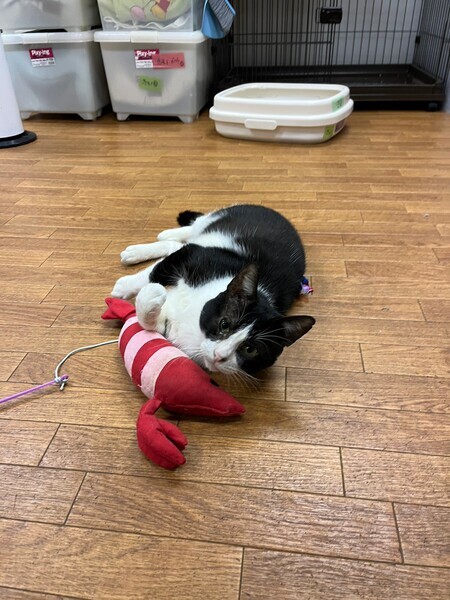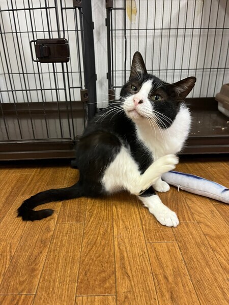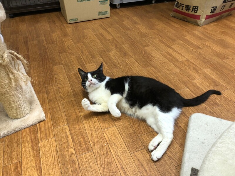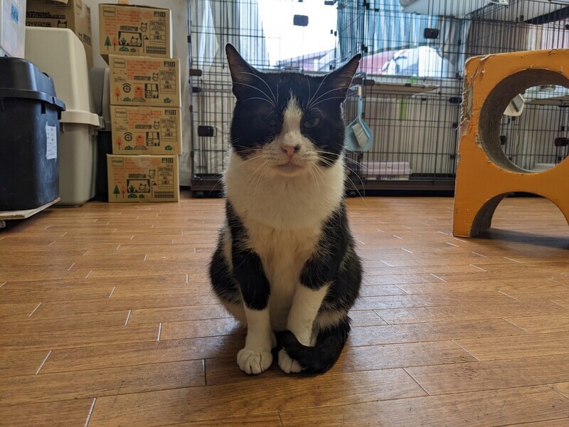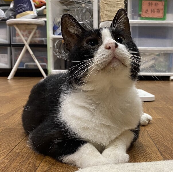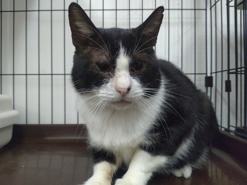 | 特徴(性格など) | 2015.8.8生まれ(推定) 毛色:白黒 うっかり捕獲機に入ってしまったことから、八兵衛と仮名がつきました! まだ人馴れバッチリ!とはいきませんが、オモチャで遊んだり、 ゴハンをくれ~とせがんだり、猫とはとっても友好的♪ 男の子にしては小柄なボディ、しっぽは長くて真っすぐ☆ ゆっくり見守って下さる里親様、大募集!! |
