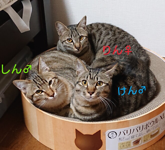 | 特徴(性格など) | 名前「しん」 ★ワクチン2回済み、エイズ白血病検査済み(どちらも陰性)便検査、駆虫済み 去勢手術済み ★人見知りなく、おっとり穏やか、笑ってるような写真がよく撮れます。兄妹の毛づくろいを良くする優しい兄貴です。 ★少し色の薄いアビシニアン風キジトラ ★初年度の検査、ワクチン、手術全て終わっています。 お留守番も大丈夫、健康です。 お仕事お持ちの方でも安心ですよ。 ★兄妹の「りん」「けん」も里親募集中です。 留守時間の長い方、お一人暮らしの方であれば、2匹飼いが安心ではありますが、強制ではありません。 |