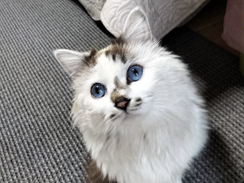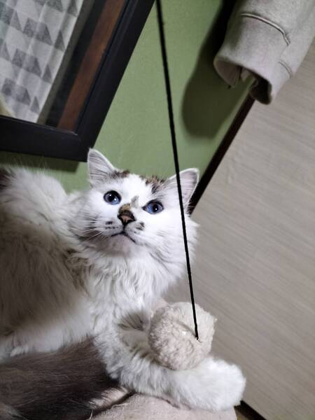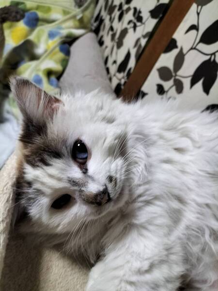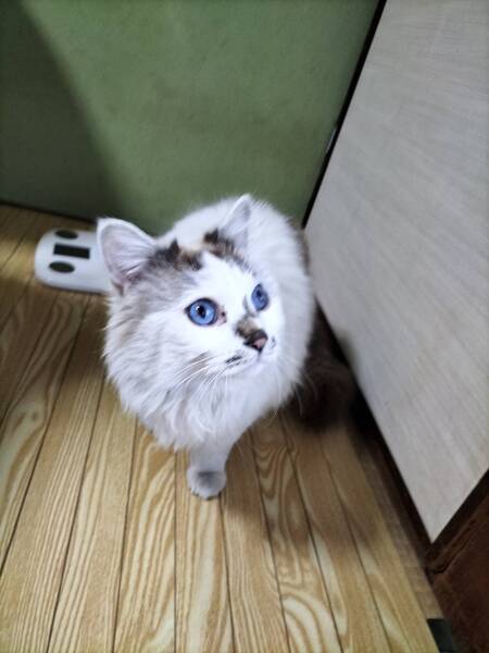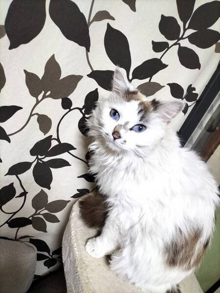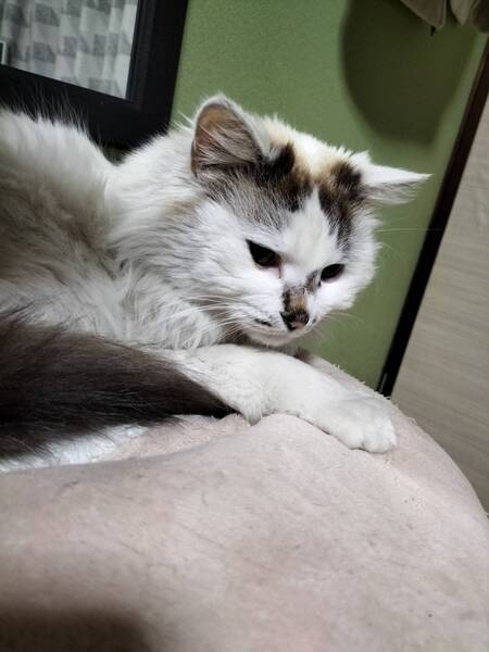 | 特徴(性格など) | とても元気です。 白にベージュとブラウンの模様が少しあります。 長毛でふわふわでとても可愛いです。 尻尾も長くきれいです。 人懐っこく、膝に乗ったり甘えんぼです。 エイズ、白血病血液検査、両方共陰性です。 |