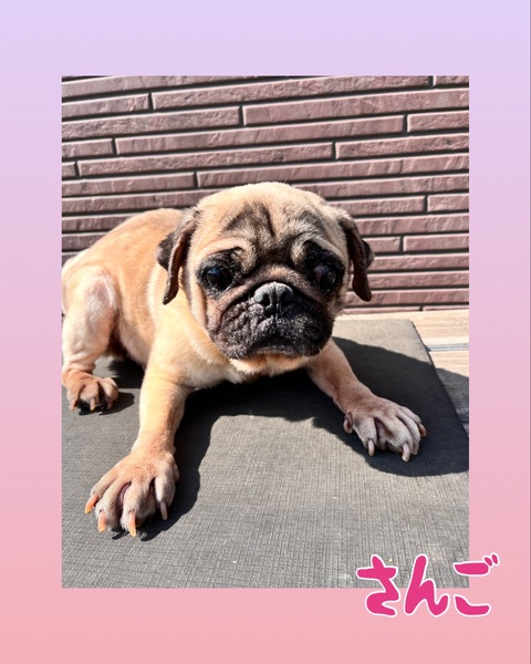 | 特徴(性格など) | 小柄なパグの女の子です。 穏やかな性格で他のワンちゃんと仲良く過ごしています。 ケージでお留守番もお利口さんにできます。 現在4.6kg |