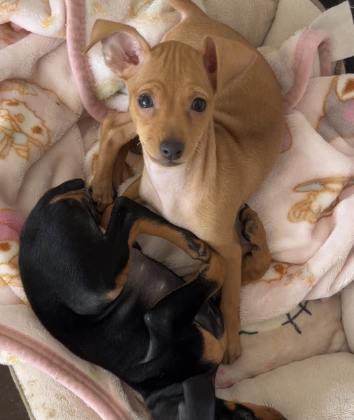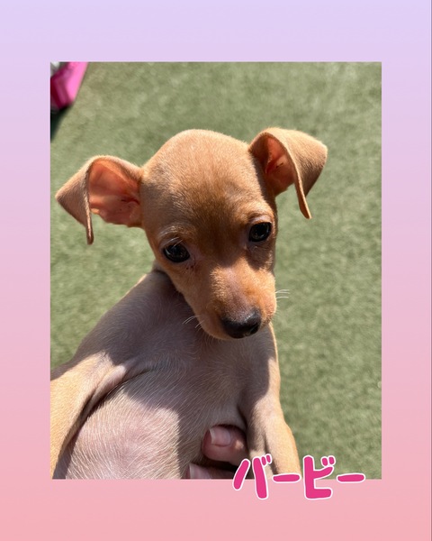 | 特徴(性格など) | レッドのミニピンパピーちゃんです。 とても元気いっぱいです。 心雑があるとの事で保護しましたが、検査の結果、小さな子に多く見られる問題のない無害性心雑でしたので、健康そのもののパピーちゃんです。 現在1.4kg |
