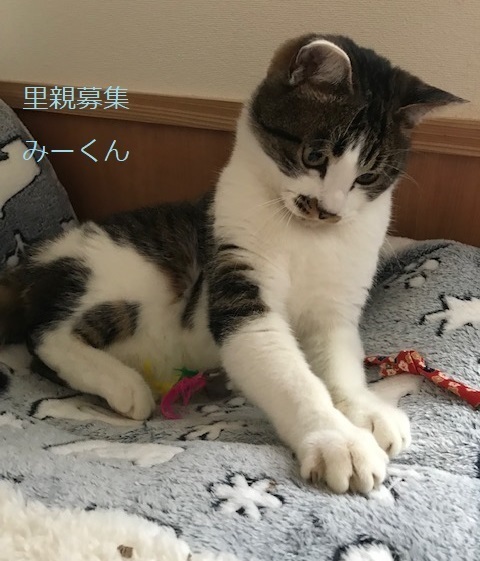 | 特徴(性格など) | キジ白猫、男の子、仮名:みーくん 推定3歳くらい、体重:4.8Kg(2023年3/7現在) 健康診断済み、駆虫済み、ブロードライン(2023年2/1) 血液検査-エイズ・白血病-ともに陰性(2022年12/26) 5種混合ワクチン接種済み(2022年9/8) 去勢手術済み トイレしつけ済み みーくんは、なっちゃんと一緒に飼われていた猫です。 みーくんは、今から3年前に、どこかの譲渡会で、子猫の時に譲り受けたそうです。元の飼い主さんはご病気で飼えなくなったので、里親募集します。 昨年の秋頃から元飼い主さんがお世話が出来なくなり、昨年の12月初め頃より、その方の両親が、家の外にケージを置いて、その中で飼われていました。 みーくんは、おそらく、ケージに入れられるのを非常に嫌がったのではないかと思います。私の家に来てから体に触ると非常に怒りました。 しかし最近では安心してきたのか、体に触っても怒りませんし、非常に甘えん坊さんです。もちろんうちでは、ケージには入れていません。 体重コントロールの為ご飯を制限されていたので、お腹がすいたら我慢できず、ご飯をお皿に入れている途中で食べようとします。➡ちゃんとご飯を用意し終えるまで待てるようになりました。 甘えん坊さんですが、心を開いてくれるまでに1ヶ月程かかりました。他の猫は苦手なようです。一緒に育ってきたなっちゃんは大丈夫ですが、他の猫と一緒にして2ヶ月、まだ近づいてきた猫に怒っています。 みーくんが安心できる家庭と甘えさせてくれる里親様募集! |
