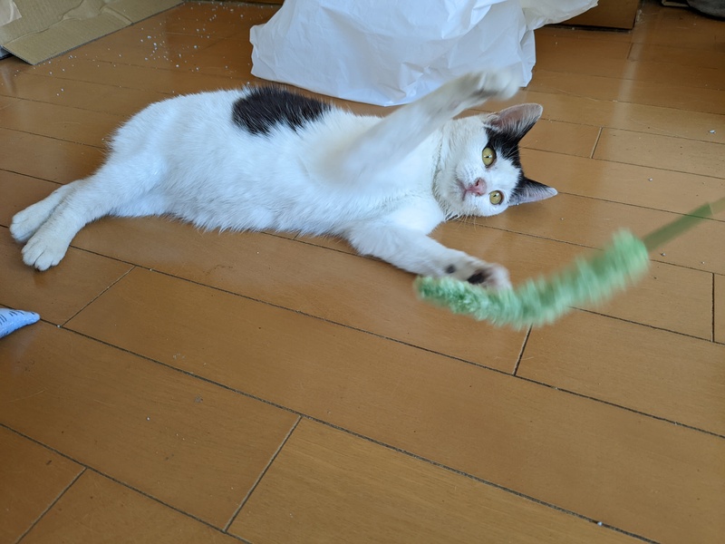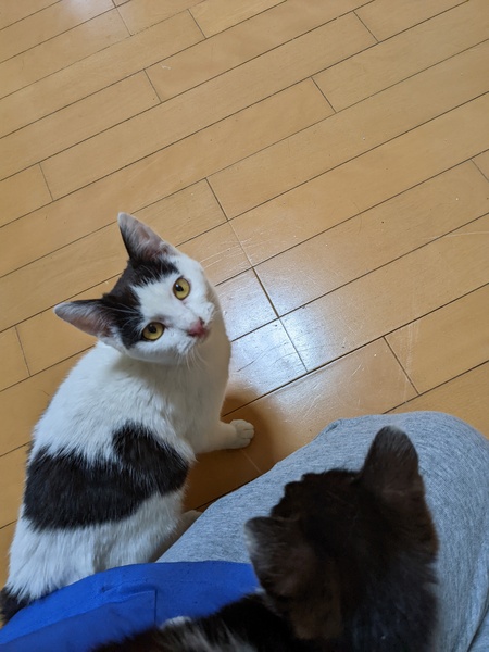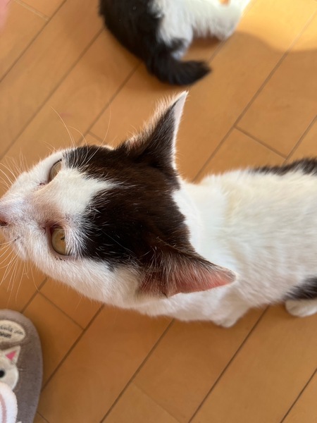 | 特徴(性格など) | 牛柄の女の子でしっぽがめちゃくちゃ短いです! とっても甘えん坊で、人の姿をみるとゴロゴロ言いながらずっとついてまわって撫でられるのも大好きです。 猫じゃらしのおもちゃが好きで1人でもずっと遊んでます! 猫風邪をひいていたので激しく遊ぶとたまにくしゃみが出てしまいます! |
