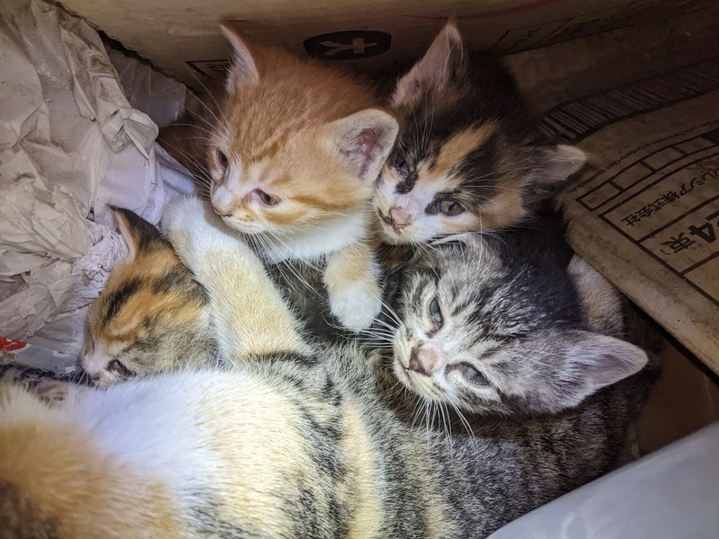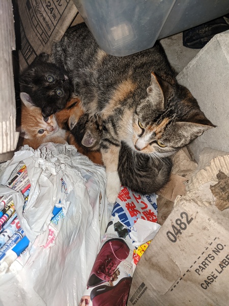 | 特徴(性格など) | 茶トラに黒:黒トラX2匹:黒ベースのブチ:茶トラに白 あと1匹いますが、母猫がガードして確認出来てません |