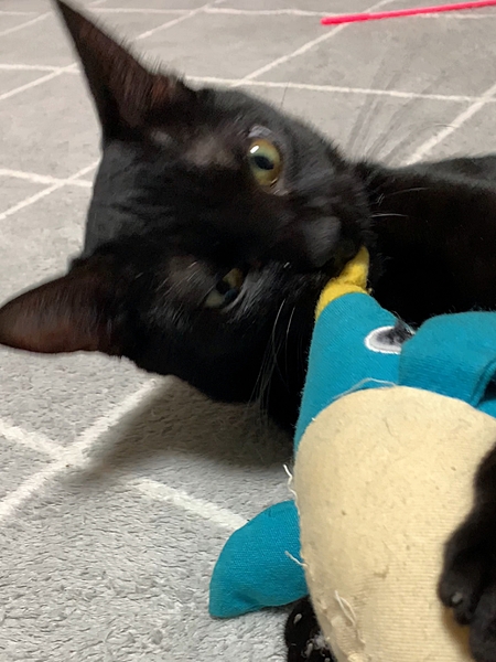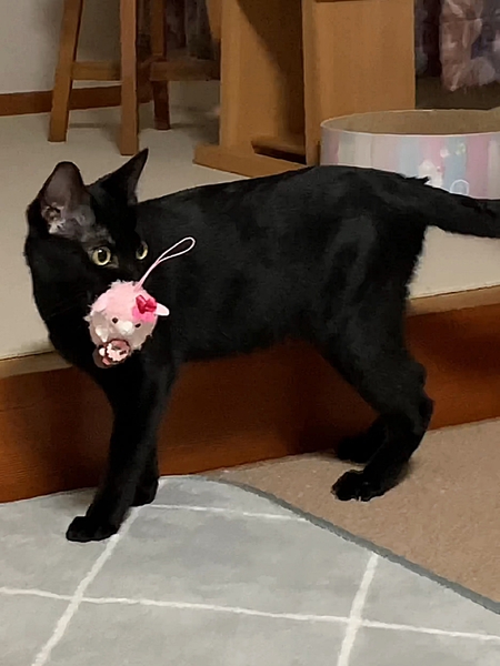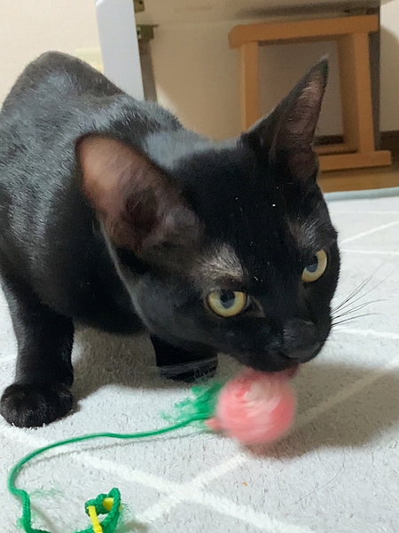 | 特徴(性格など) | 推定生後8ヶ月の男の子。 とても人懐こい猫ちゃんです。 超甘えん坊で、人も猫も大好き!天真爛漫な男の子です! 大好きなぬいぐるみのおもちゃを投げると持って来る、とっても賢い子です。 元気いっぱいで食欲旺盛です。 長い尻尾、スレンダーな容姿 ビロードのような真っ黒な毛並みが綺麗! |