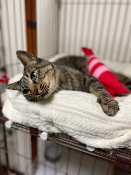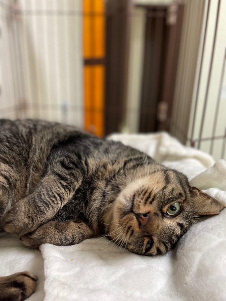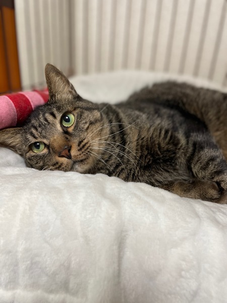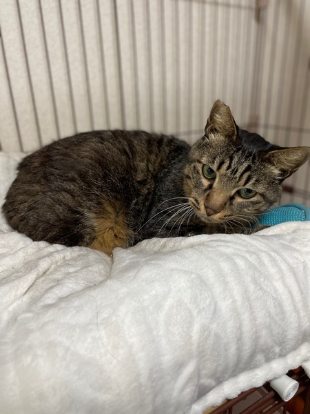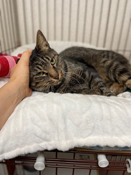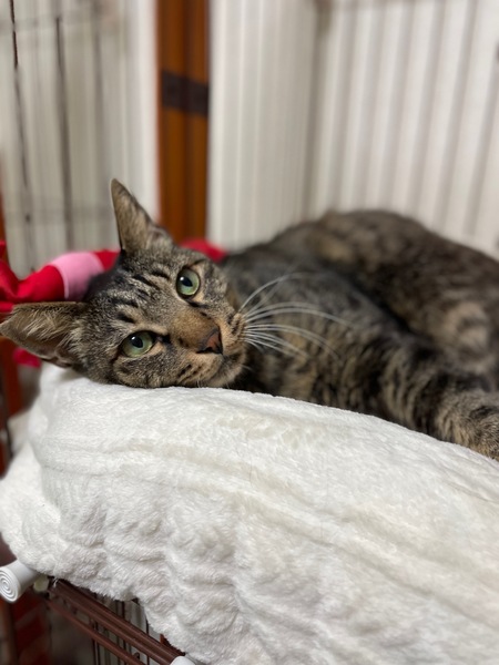 | 特徴(性格など) | キジトラ柄の男の子で年齢は2歳前後です 現在の体重は5kgくらい、グリーンの瞳がとてもきれいです 毛がフワフワで柔らかく、尻尾は長めで真っすぐです 性格は甘えん坊で人馴れしておりとても良い子です 自分から頭をグイグイ突き出してきて撫でてアピールしてきます 顔を近づけると自分の顔をくっつけてくるような可愛い子です お尻トントンとブラシが大好きでお腹をモミモミされるのもお気に入りです 夜は静かに寝てくれて、無駄鳴きのない良い子です フードはドライ、ウェット何でも食べてくれてトイレも問題ありません |