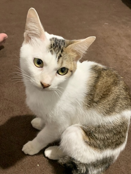 | 特徴(性格など) | 色柄:三毛猫で鍵尻尾 性格:活発、超甘えん坊 趣味:食べる事、じゃらし遊び(紐好き) 特技:添い寝、食べ物の好き嫌い無し ※猫白血病陰性、猫エイズ陽性 |