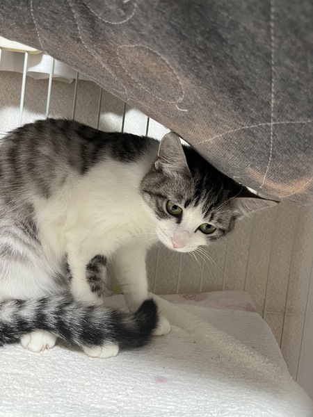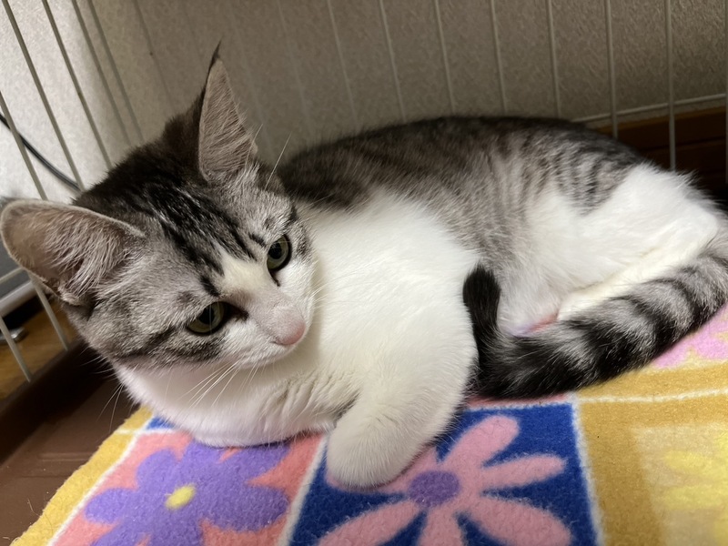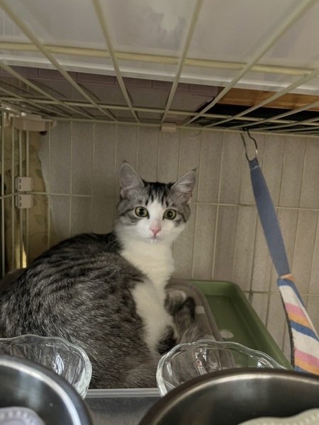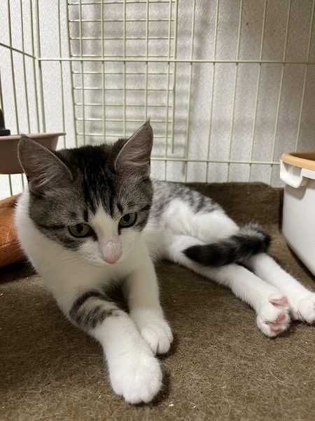 | 特徴(性格など) | 人馴れ訓練中 未だシャーシャー言って、逃げたり隠れたりしますが、ケージの中で撫で始めると、ゴロンと横になり気持ちよさそうに目を細めて大人しく触らせてくれます。 手からおやつも食べてくれるようになりました。 先住猫達にも慣れ始め、未だ犬は見慣れて来た程度です。 臆病ですが、元気 検便、ノミダニ駆除すみ ワクチン2回接種済み、猫エイズ、白血病ウィルス検査陰性、避妊手術未 |