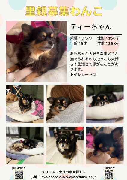 | その他(譲渡条件など) | ティーの里親募集を見て下さり有難う御座います。 里親様とこの子の幸せのために細かな条件がありますが、 ご理解いただきますようよろしくお願いいたします。 【譲渡費用】 ・医療費を一部 ・お届けにかかる交通費(高速代+ガソリン代) 上記のご負担を里親様にお願いしております。 お届け先により費用が異なりますのでご相談ください。 【譲渡条件】 ・静岡県内の方か静岡市内から車で2時間以内の方 ・完全室内飼育、リビング等で常に人と同じ空間で生活させてくれる方 (玄関のみ/ベランダのみ不可) ・ケージに入れっぱなし不可 ・逃走対策をして頂ける方 ・室内の滑り止め対策をして頂ける方 ・動物を適切に飼育する為に経済的余裕がある方 里親希望の方は以下を必ずご記入下さい。 ・お住いの都道府県 ・お名前 ・ご家族構成、年齢 ・【ティー】を希望する理由 【譲渡できない方】 恐れ入りますが以下に該当する方はお断りしております。 ・高齢者のみの世帯(65歳以上) ・日常的に6時間以上犬をお留守番させてしまう方 ・叱る叩く怒鳴る等の躾をされる方 ・中学生未満のお子さんが居るお宅 【ご確認事項】 ・外飼いではなく、必ず室内フリー(エアコン必須)での飼育が可能な方 ・愛情を持って朝晩のお散歩や必要な運動、スキンシップやコミュニケーションに時間を充てられる方 以上になります。 些細なことでもご不明点がありましたらお尋ねください。 |