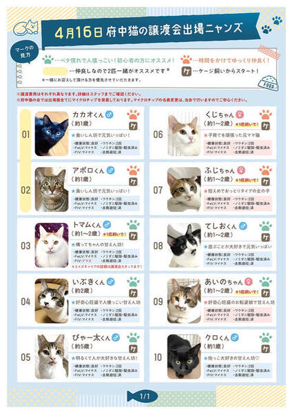 | その他(譲渡条件など) | ୨୧⌒⌒⌒⌒⌒⌒⌒⌒⌒⌒⌒⌒⌒୨୧ 府中駅から直結 成猫多数の譲渡会のお知らせ ୨୧⌒⌒⌒⌒⌒⌒⌒⌒⌒⌒⌒⌒⌒୨୧ 【日時】4月16日(日)13時〜15時半まで 【場所】LIGHT UP LOBBY (下記のリンクに詳細あり) https://chuneko.exblog.jp/32603337/ ※会場への直接のお問い合わせはお控えください。 ご質問はfuchu_nekonokai@yahoo.co.jpまでよろしくお願いします。 お待たせ致しました! 4月の譲渡会開催のお知らせです。 今回出場するにゃんずは、全匹成猫さんのみの譲渡会となります なんと言っても成猫さんの魅力の理由は お仕事をお持ちのご家庭でも、問題なく迎えられるお留守番OKな子達だという事です どのご家庭も、日々の暮らしがあり、そして共働きは当たり前のご時世です。 そんなご家庭でも猫ちゃんを迎えていただける事はできます❗️ フルタイムでお仕事をお持ちのご家庭でも、今回出場する子達ならば全く問題なく迎えていただけます。 譲渡会にてご紹介させていただく猫ちゃん達は、全て家庭猫訓練を受けた子達です。 猫ちゃんを家族として迎えたいな。 迎えるならば保護猫を飼いたいな… そんな方々との出会いをお待ちしております。 熊本市殺処分STOPプロジェクトを立ち上げ、熊本市から空輸してきたかわいい子達。 元野良猫として産まれ、頑張って生き抜いてきたかわいい子達。 そして、飼い主から飼育放棄された子など、みんなそれぞれ辛い過去を乗り越えて、やって来た子達ばかりです。 まだ若い子達ばかりなので、これからの第二の猫生を幸せにしてくださるご家族との素敵な出会いをお待ちしております。 ▶今回出場する猫ちゃん達は、若い子は一歳未満から約2〜3歳の猫ちゃんばかりで、一番上の子が5歳です。全匹、去勢or避妊手術済みであり、マイクロチップも装着。 ▶フルタイムでお仕事をお待ちのご家庭でも、お留守番は出来ますので、問題なく受け入れていただけます。 ▶お届けする準備から、お迎えていただけた後のアフターケアーもキッチリとさせていただきますのでご安心ください。 ₍ᐞ•༝•ᐞ₎◞ ̑̑ コロナ対策の為、入場制限をさせていただきますが、ご予約の必要はございません。 入り口カウンターにてスタッフが整理券を配布いたしますのでご協力お願い申し上げます。 ₍ᐞ•༝•ᐞ₎◞ ̑̑ 初めて猫ちゃんを迎える方(特にお子様のいるご家庭)は、猫アレルギーの有無を明確にしてくださると私達も選考しやすいです。 ₍ᐞ•༝•ᐞ₎◞ ̑̑ 譲渡会はお見合いのみの場となっております。ご来場前に必ず下記の事項をご参照ください。 【譲渡会のシステムについて】 https://chuneko.exblog.jp/32604872/ ₍ᐞ•༝•ᐞ₎◞ ̑̑ 初めて猫ちゃんを迎える方(特にお子様のいるご家庭)は、猫アレルギーの有無を明確にしてくださると私達も選考しやすいです。 ₍ᐞ•༝•ᐞ₎◞ ̑̑ 譲渡会に出場する猫ちゃん達の保護時からの情報などYouTube【ちゅー猫チャンネル】にて配信しております。 https://youtube.com/@chuneko 頑張って生き抜いて来たちゅー猫子ども達との、素敵なご縁をお待ちしております♡ ฅ^•ﻌ•^ฅ♡ ご見学やグッズ購入希望者の方々へ ฅ^•ﻌ•^ฅ♡ 会場はカフェ営業をしておりますので、お飲み物だけオーダーしていただければ、中のお席でお寛ぎできるようになっております。 受付カウンターのスタッフに一言お伝えください。 今回は、出場頭数をかなり少なくしておりますので、お気兼ねなく遊びにいらしてくだれば幸いです。 ぜひ!遊びに来てください!ฅ^•ﻌ•^ฅ♡ |
