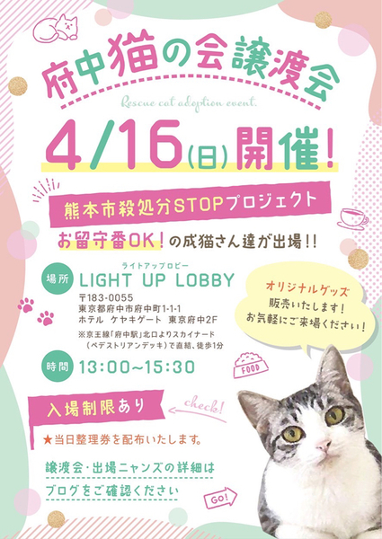 | その他(譲渡条件など) | ୨୧⌒⌒⌒⌒⌒⌒⌒⌒⌒⌒⌒⌒⌒୨୧ 府中駅から直結 成猫多数の譲渡会のお知らせ ୨୧⌒⌒⌒⌒⌒⌒⌒⌒⌒⌒⌒⌒⌒୨୧ 【日時】4月16日(日)13時〜15時半まで 【場所】LIGHT UP LOBBY (下記のリンクに詳細あり) https://chuneko.exblog.jp/32603337/ ※会場への直接のお問い合わせはお控えください。 ご質問はfuchu_nekonokai@yahoo.co.jpまでよろしくお願いします。 お待たせ致しました! 4月の譲渡会開催のお知らせです。 今回出場するにゃんずは、全匹成猫さんのみの譲渡会となります なんと言っても成猫さんの魅力の理由は お仕事をお持ちのご家庭でも、問題なく迎えられるお留守番OKな子達だという事です どのご家庭も、日々の暮らしがあり、そして共働きは当たり前のご時世です。 そんなご家庭でも猫ちゃんを迎えていただける事はできます❗️ フルタイムでお仕事をお持ちのご家庭でも、今回出場する子達ならば全く問題なく迎えていただけます。 譲渡会にてご紹介させていただく猫ちゃん達は、全て家庭猫訓練を受けた子達です。 猫ちゃんを家族として迎えたいな。 迎えるならば保護猫を飼いたいな… そんな方々との出会いをお待ちしております。 熊本市殺処分STOPプロジェクトを立ち上げ、熊本市から空輸してきたかわいい子達。 元野良猫として産まれ、頑張って生き抜いてきたかわいい子達。 そして、飼い主から飼育放棄された子など、みんなそれぞれ辛い過去を乗り越えて、やって来た子達ばかりです。 まだ若い子達ばかりなので、これからの第二の猫生を幸せにしてくださるご家族との素敵な出会いをお待ちしております。 ▶今回出場する猫ちゃん達は、若い子は一歳未満から約2〜3歳の猫ちゃんばかりで、一番上の子が5歳です。全匹、去勢or避妊手術済みであり、マイクロチップも装着。 ▶フルタイムでお仕事をお待ちのご家庭でも、お留守番は出来ますので、問題なく受け入れていただけます。 ▶お届けする準備から、お迎えていただけた後のアフターケアーもキッチリとさせていただきますのでご安心ください。 ₍ᐞ•༝•ᐞ₎◞ ̑̑ コロナ対策の為、入場制限をさせていただきますが、ご予約の必要はございません。 入り口カウンターにてスタッフが整理券を配布いたしますのでご協力お願い申し上げます。 ₍ᐞ•༝•ᐞ₎◞ ̑̑ 初めて猫ちゃんを迎える方(特にお子様のいるご家庭)は、猫アレルギーの有無を明確にしてくださると私達も選考しやすいです。 ₍ᐞ•༝•ᐞ₎◞ ̑̑ 譲渡会はお見合いのみの場となっております。ご来場前に必ず下記の事項をご参照ください。 【譲渡会のシステムについて】 https://chuneko.exblog.jp/32604872/ ₍ᐞ•༝•ᐞ₎◞ ̑̑ 初めて猫ちゃんを迎える方(特にお子様のいるご家庭)は、猫アレルギーの有無を明確にしてくださると私達も選考しやすいです。 ₍ᐞ•༝•ᐞ₎◞ ̑̑ 譲渡会に出場する猫ちゃん達の保護時からの情報などYouTube【ちゅー猫チャンネル】にて配信しております。 https://youtube.com/@chuneko 頑張って生き抜いて来たちゅー猫子ども達との、素敵なご縁をお待ちしております♡ ฅ^•ﻌ•^ฅ♡ ご見学やグッズ購入希望者の方々へ ฅ^•ﻌ•^ฅ♡ 会場はカフェ営業をしておりますので、お飲み物だけオーダーしていただければ、中のお席でお寛ぎできるようになっております。 受付カウンターのスタッフに一言お伝えください。 今回は、出場頭数をかなり少なくしておりますので、お気兼ねなく遊びにいらしてくだれば幸いです。 ぜひ!遊びに来てください!ฅ^•ﻌ•^ฅ♡ |