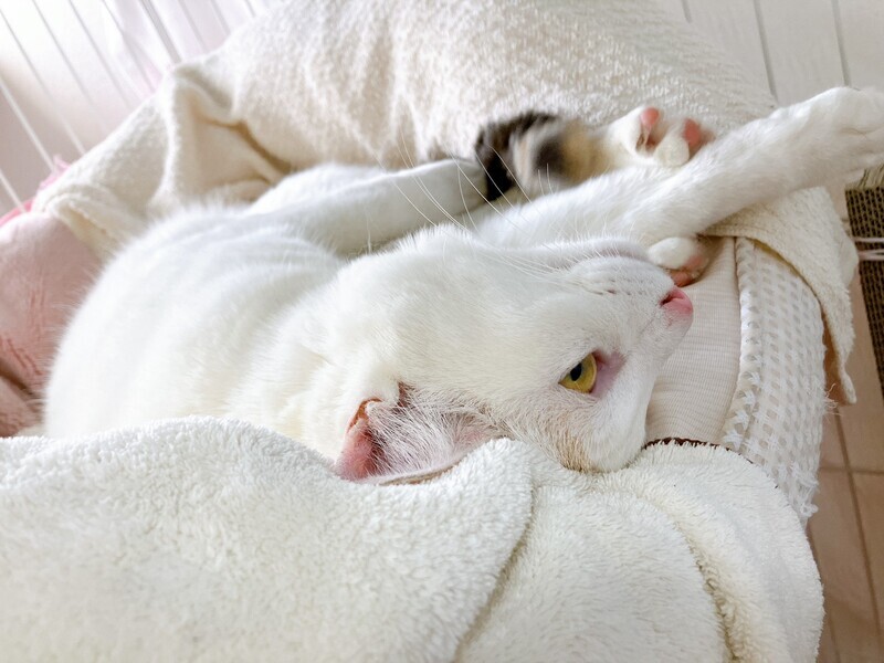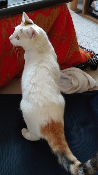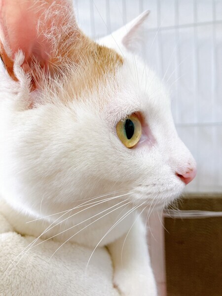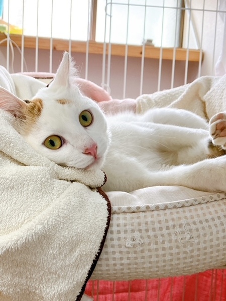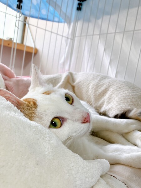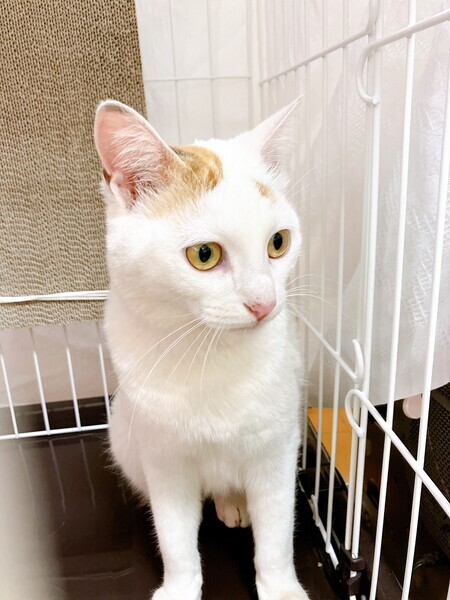 | 特徴(性格など) | 白が多く、右耳としっぽのみ三毛の柄があります。とても懐いていて、誰にでも抱っこできます。 トイレは完璧。ケージを汚しません。 夜もおとなしく眠れます(我が家は) 耳カットなし 体重3.2キロ |