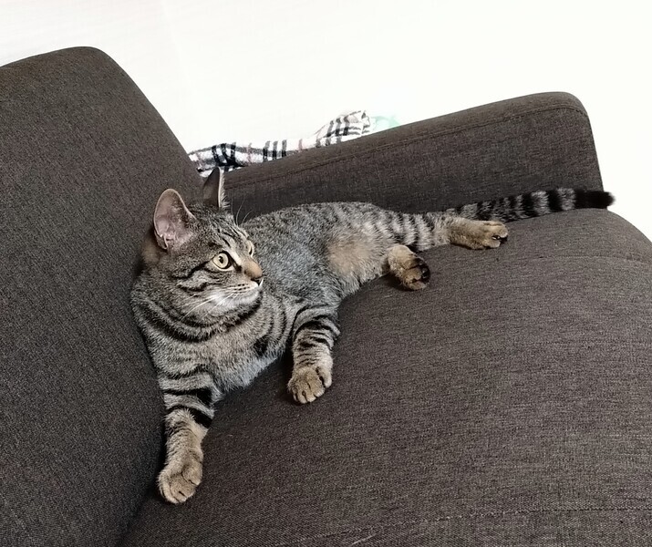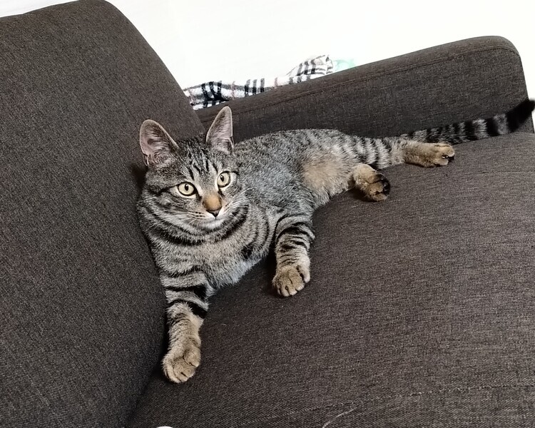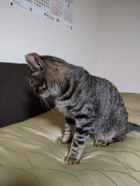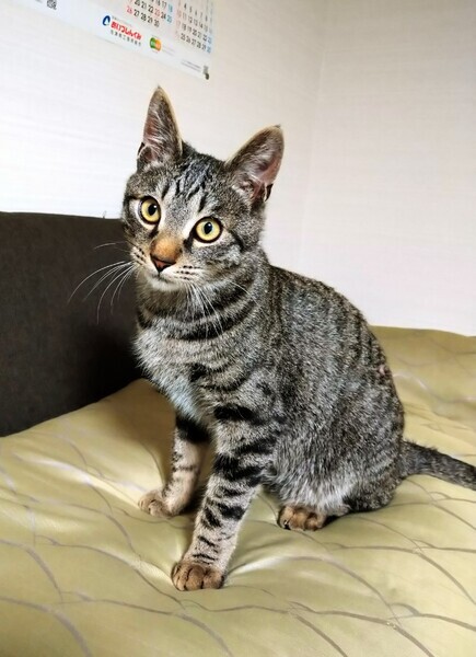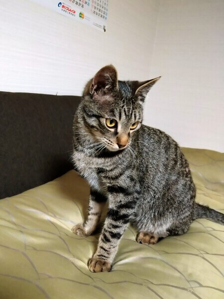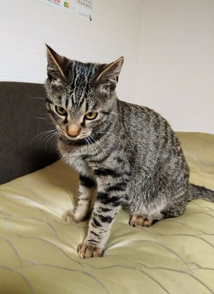 | 特徴(性格など) | 令和4年8月生まれの甘えん坊のキジトラ♂です。三兄弟の長男として生まれて、3匹の中では一番おとなしい性格でした。生後2ヶ月からずっと一匹で飼われていたので、とても人懐っこい性格でかまってちゃんです。小さい時から愛情表現として、顔に自分の顔を押し付けてきます。生まれてからずっと室内飼いされています。令和5年3月に去勢手術済です。健康体そのもの、モリモリ餌も残さず食べて毎日快便です。トイレもしっかりできるのでほとんど粗相もしません。紙を丸めた小さなボールで遊ぶのがこの上なく大好きで、まだまだ子供わんぱく盛りです。 | ||