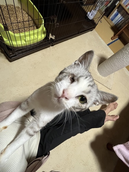 | 特徴(性格など) | スイッチが入ればハイパーに走り回ります。 抱っこ大好き、胸元に飛びついてきたりと超甘えたサンです。 他の猫への警戒心&遠慮がなさ過ぎて、単頭飼いの方が向いているかも? ※右目が委縮しています。 |