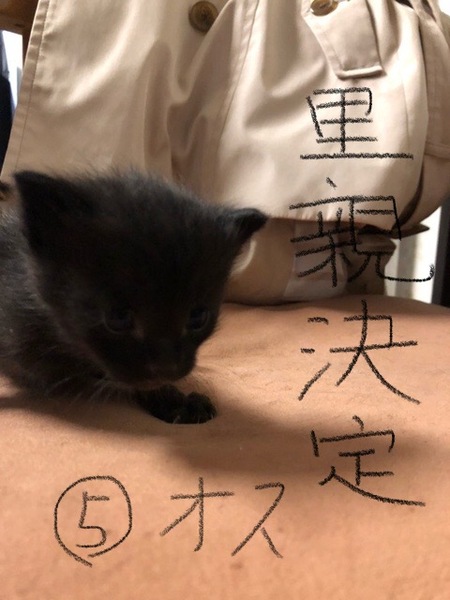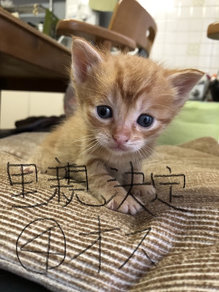 | 特徴(性格など) | 4月7日生まれの5匹、現時点性別はまだハッキリ分かりません。 キジトラ(メス)2匹・シバトラ(オス)・茶トラ(オス)・黒(オス) しっぽは真っ直ぐで長いですが、キジトラ(1匹)が先端カギの様に曲がってます。 |