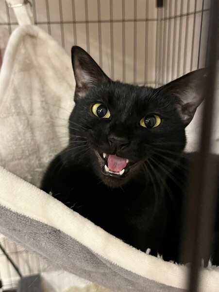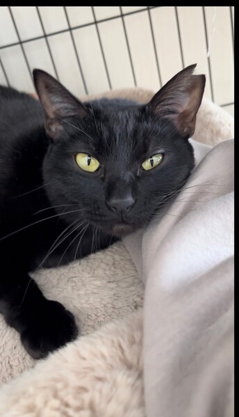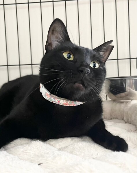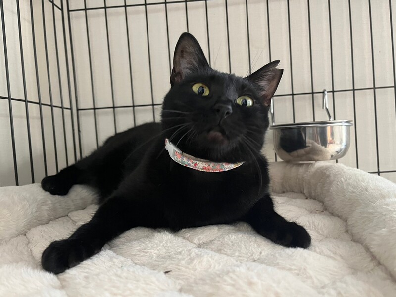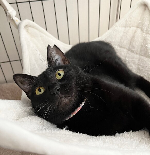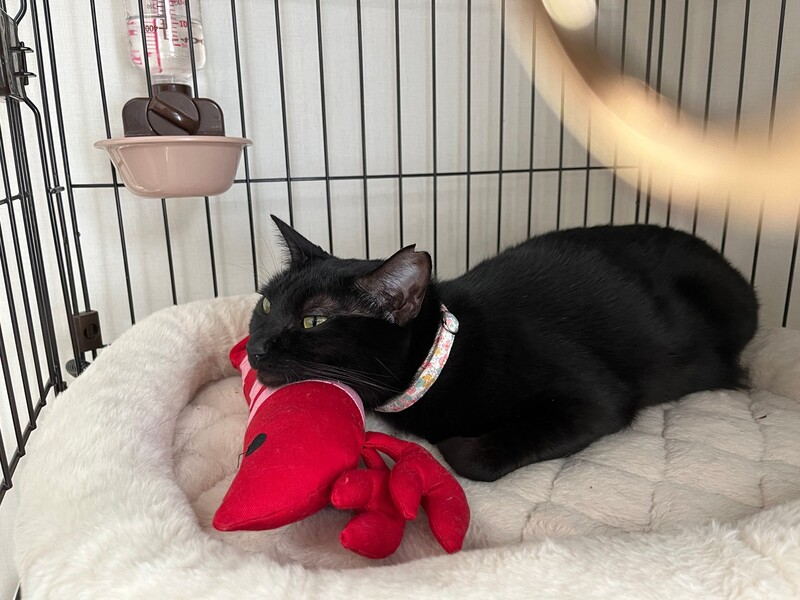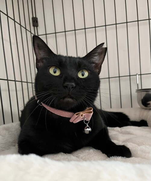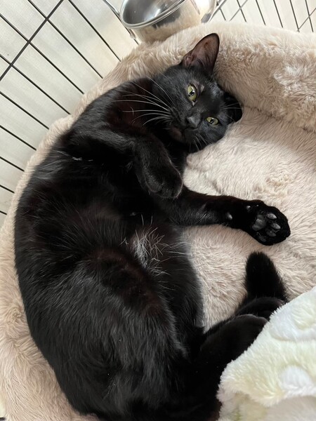 | 特徴(性格など) | 2018.9.6生まれ(推定) 毛色:黒 とても美人な黒猫の女の子。 保護当時はとても怖がりでしたが、人馴れ修行をへて人に懐くようになりました。 自分からスリスリする事が多くなり、ニャーンと甘えてきてくれます。 全身撫でられたり、お腹も見せてくれます。 小さいおもちゃを追いかけて遊んだり、毛布をフミフミしたりします。 お返事上手でご飯やおやつの問いかけには可愛い声で返事をしてくれます。 猫も大好きで猫にもよく話しかけています。 大きな音はまだ苦手なので、落ち着いた飼育環境の里親様が希望です。 |