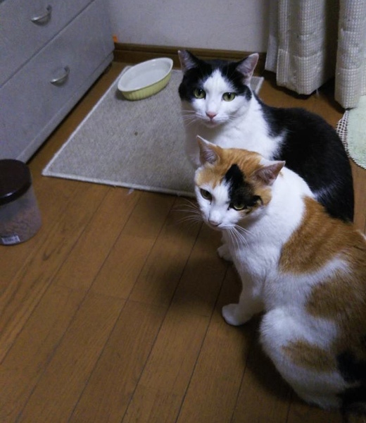 | 特徴(性格など) | ・三毛猫(現在の名前ミー子) 抱っこが好きな甘えん坊で、人が好きです。 新聞の上に乗ってきたり、「ミャー」と可愛い声で話しかけてきます。 大きさは普通で少し少食です。 ・ハチワレ(現在の名前チビ) 抱っこはあまり好きではなく、ご飯の催促以外あまり鳴き声も聞きません。 嬉しい時はシッポをピンと立てて表現してくれます。 手足が長めで小顔。大きさは普通ですがよく食べます。 |