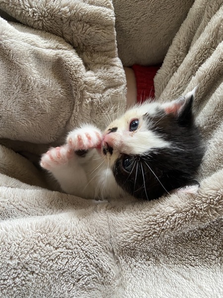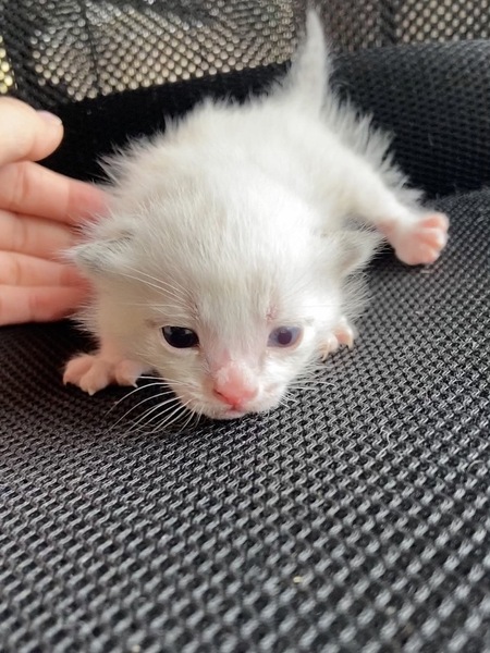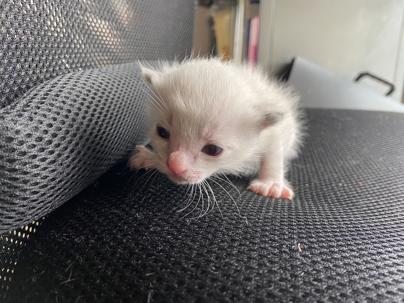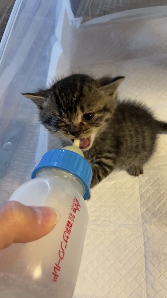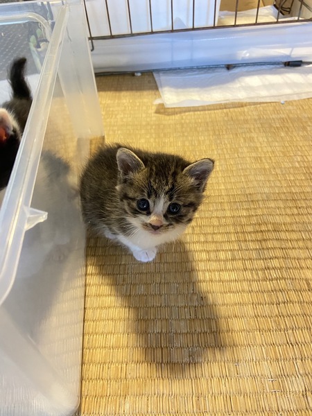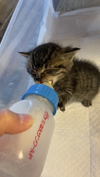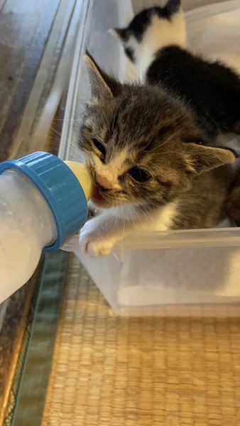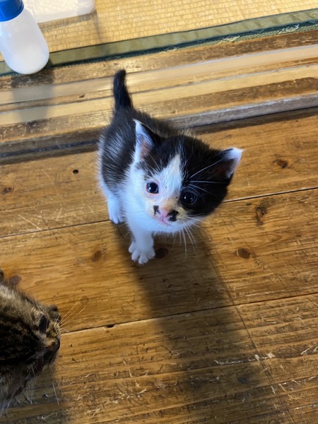 | 特徴(性格など) | 四匹とも物凄く懐っこく、捕まえた時も全く威嚇してきませんでした。非常に活発的ですが、無駄鳴きはしません。健康状態も良好です。黒色の子猫は目が少し腫れてしまっていますが、抗生物質をあげていますので良くなると思います。トイレも覚えましたし、カリカリも食べられるようになりました。 白いのはまだ生まれて二週間程だと思うので離乳していませんが、もうじき乳離れもすると思います。 この子も良くミルクを飲んで良く寝ているので、順調に成長しています。 |