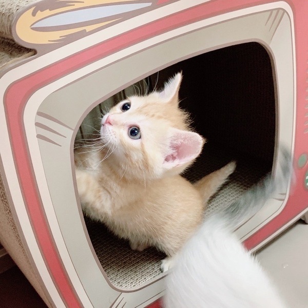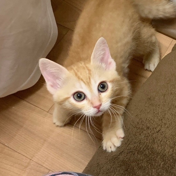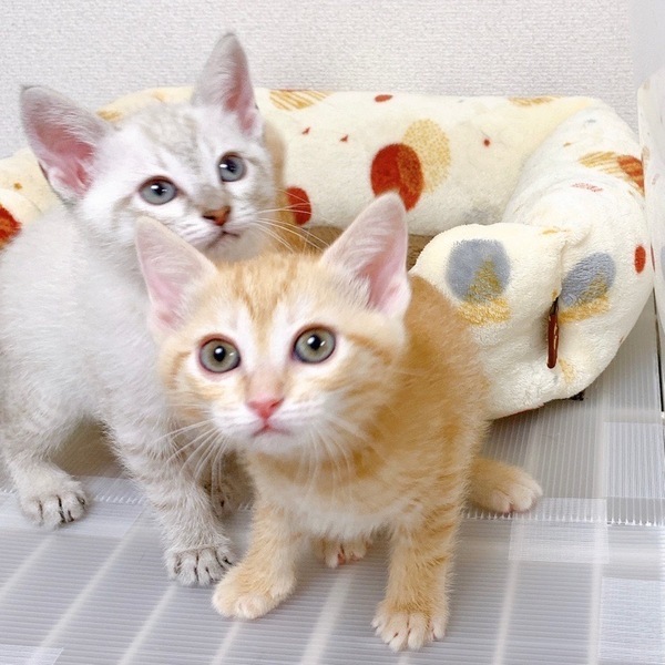 | 特徴(性格など) | お目目パッチリな美猫さん。兄妹唯一の女子ですが、男子たちにまったく引けを取らない位に元気一杯なおてんば娘です!可憐な見た目とは裏腹にとても活発で、いつも兄弟たちと走り回っています。 愛護センターから来た時にはまだ250g弱だったので人間がミルクで育てました。そのおかげか?大変人懐っこく、人間を全く怖がりません。むしろついてきます(笑)遊び疲れて電池が切れると、急に寝ます(笑)また人間の膝の上も大好きです。 食欲も旺盛で何でもよく食べます。少しずつかりかり(ドライフード)も食べていますが、意外にかりかり派のようです。 まだまだ子猫ですので、健康管理をしっかりしてくださる方、また安全に暮らせる様にお部屋のお片付け、目に見える形での脱走防止対策を徹底してくださる方とご縁がつながると嬉しいです。 対策等でわからないことは アドバイスさせていただきますので、疑問点などは遠慮なく聞いていただきたいです。 ご自宅の玄関・開ける窓・ケージを置くお部屋などのお写真をご持参いただきますと、より具体的なお話ができると思います。 兄妹のつぶくんとはとても仲良しで毎日パワフルに遊んでいますので、2匹一緒のお迎えも大歓迎です! |