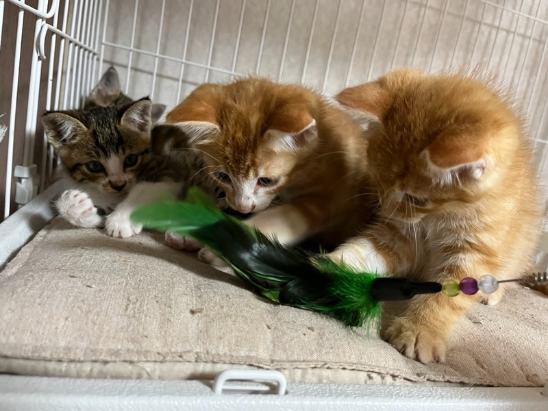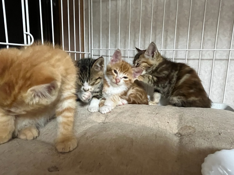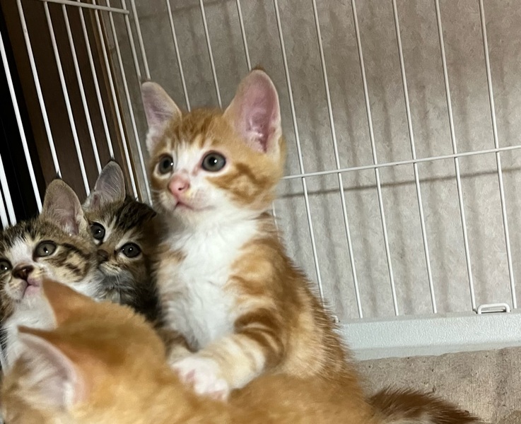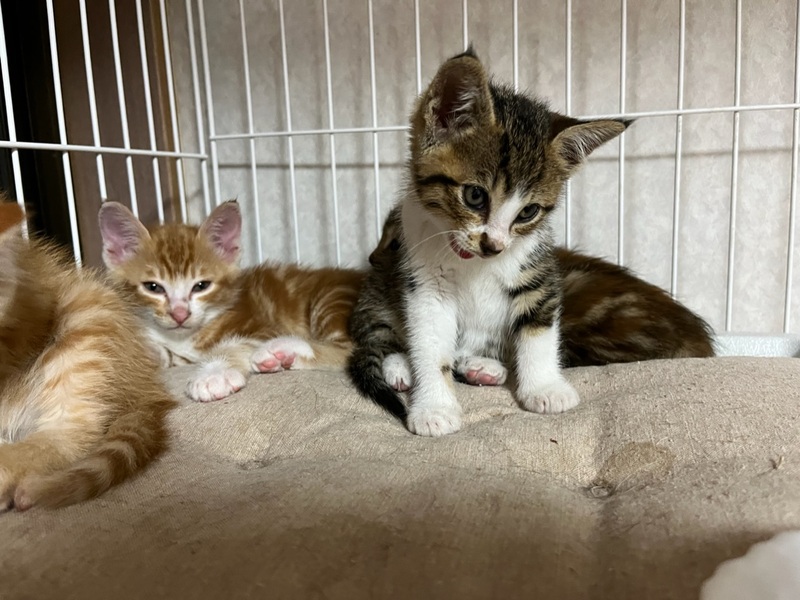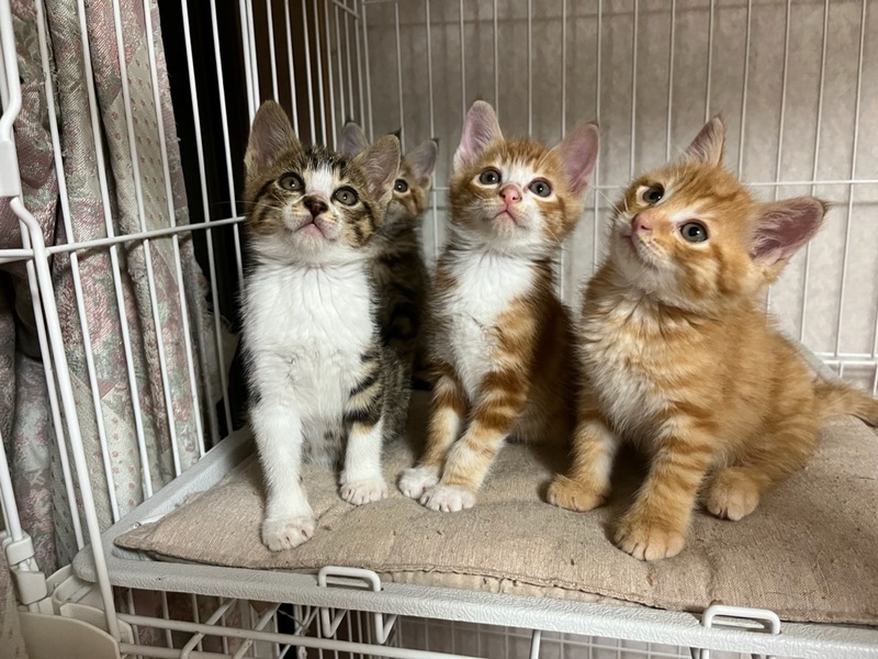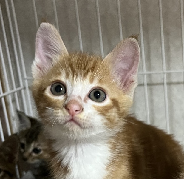 | 特徴(性格など) | 【見た目】 アメショ風 茶トラの男の子です。 (レッドクラシックタビー&ホワイト) もう少しふっくらしてくればもっとかわいいお顔になると思います。 顔付きはマズル(鼻筋)が長めでシュッとしていて、毛色的にはアメショが混ざっているようです。 毛並みは和猫で、固めのさわり心地。 尻尾は長くてまっすぐです。 【性格】 保護後1~2日はケージの隅にうずくまってなかなか顔も見れませんでしたが、 今はゴロゴロと甘えるようになりました。 毎日どんどん人慣れしてきています! 最初からべた慣れな子もかわいいですが、こういうシャイな子は慣れるとすごく甘えん坊なことが多いです。 食いしん坊な一面があり、同じく食いしん坊なキジ白ちゃんとご飯の取り合いになると、「みゃん!」と怒ってご飯の皿を抱え込みます笑 怖がりさんで、一匹だとお家になじむのに時間がかかりそうなので、できればどちらかの兄弟2匹でもらっていただける方だとうれしいです。 もちろん一匹でも、ご応募は可能です。 ゆっくりとこの子と向き合ってくださる方、お待ちしております。 【健康状態】 猫風邪はほぼ完治。 栄養が足りていなかったのか、まだ痩せています。 今は頑張ってたくさん食べて、ふっくら健康を目指している最中です。 トイレは完璧! 猫エイズ・白血病検査については、まだ月齢が幼く、負担が大きいこと&正確な結果が出ないため未検査です。 |