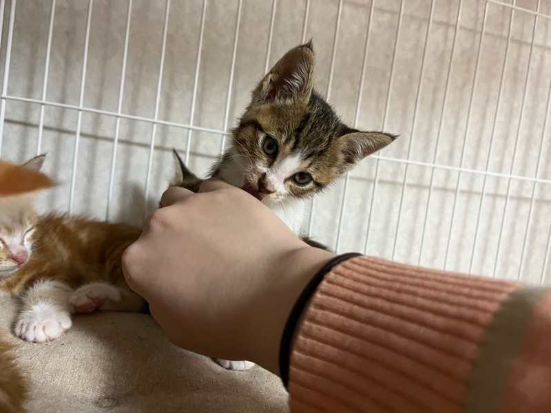 特徴(性格など) | 【見た目】 兄弟の中で一番のちびっこ。 普通のキジ白ちゃんです。 しっぽは長くてまっすぐ。 目は治療中ですが、日に日によくなっています。 【性格】 寂しがりで甘えん坊。 保護してすぐ病院に連れて行った帰り道で、すでにゴロゴロ甘えているくらい、甘えん坊でとってもかわいい子です。 完全野良だとこんなにすぐに慣れないので、親と一緒に捨てられた子だと思います。 小さな体で甘えてくる様子はとても可愛く、愛らしいです。 体は小さいのにパワフルで、ご飯を上げると同じく食いしん坊なアメショ茶トラ君と取り合いをします笑 【健康状態】 この子だけ保護が遅れたので、猫風邪の状態が一番ひどく、現在治療中です。 また、栄養が足りていなかったのか、まだ痩せています。 今は頑張ってたくさん食べて、ふっくら健康を目指している最中です。 猫エイズ・白血病検査については、まだ月齢が幼く、負担が大きいこと&正確な結果が出ないため未検査です。 |
