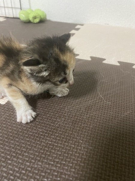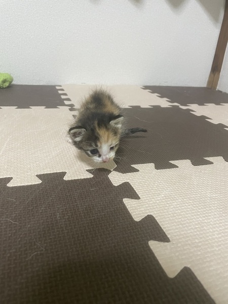 | 里親募集する理由 | 雨の日に家の近くの廃屋で子猫を保護しました。草木に絡まって奥の方で鳴いていたので、母猫が助け出さないと思い見捨てられた子猫だと思います。保護した日に動物病院に連れて行きましたが、この子は片方の目だけ目ヤニがあって、目薬をもらいました。それ以外は大丈夫です。 どうかこの子をお助けください。 |