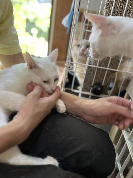 | 特徴(性格など) | ◆カゴヨンくん やや怖がりだけどスリゴロな白猫くん ○鹿児島県内の多頭飼育崩壊現場より保護しました。 ○推定1歳未満くらい(2023年5月時点)のブルーアイの白猫の男の子です。体重は3,64kg(2023年4月15日時点)です。 ○尻尾は長めです。 ○避難所に来た当初は慎重に人を観察しているようでした。現在は安全な場所だと分かったようで、スリゴロさんです。 ○少しビビりな面もありますが、ナデナデ大好きでお膝にも乗ってくれるかわいい甘えん坊です。 ○食べ物にはとても積極的です。 ★ワクチン1回済み、不妊手術済み。 ★猫エイズ、猫白血病ともに陰性。 ☆単身のかたはご相談ください。 ○YouTubeにも動画を上げています。こちらもご覧下さい。 「カゴヨン」その1 https://youtu.be/BNIMsnjKdrw 「ガゴヨン」その2 https://youtu.be/xh3kFzcQSR8 ○6/18(日)開催の譲渡会に参加予定!下の要項をお読みいただき、ぜひ会いに来てください♪ ☆★☆★☆★☆★☆★☆★☆★☆★☆★☆★☆★☆★☆★☆★☆★☆★☆★☆★☆ ~6月18日(日)市ヶ尾にて譲渡会開催!~ ◎場所・・「東急ドエル市ヶ尾プラーザビル2階集会場」 神奈川県横浜市青葉区市ヶ尾町1154-2 田園都市線「市ヶ尾」駅西口より徒歩約2分 ◎日程・・6月18日(日)(雨天決行) ◎時間・・13時から16時(受付は15時30分まで) (会場に利用可能な駐車場はございません。近隣のコインパーキングをご利用ください。) *12時45分より入場ご案内を致します。それより早く来て並ぶ事はご遠慮下さい。 *参加の際は、マスクの着用、アルコール消毒のご協力をお願いいたします。 *当日は検温の上、体温が37度以上の方はご参加いただけません。 *混雑状況により、入場制限をさせていただく場合がございます。 ※参加予定の犬猫は体調により参加できない場合があります。ご了承ください。 ☆★☆★☆★☆★☆★☆★☆★☆★☆★☆★☆★☆★☆★☆★☆★☆★☆★☆★☆ |