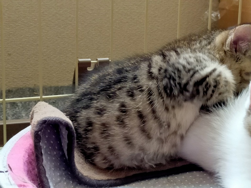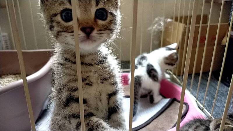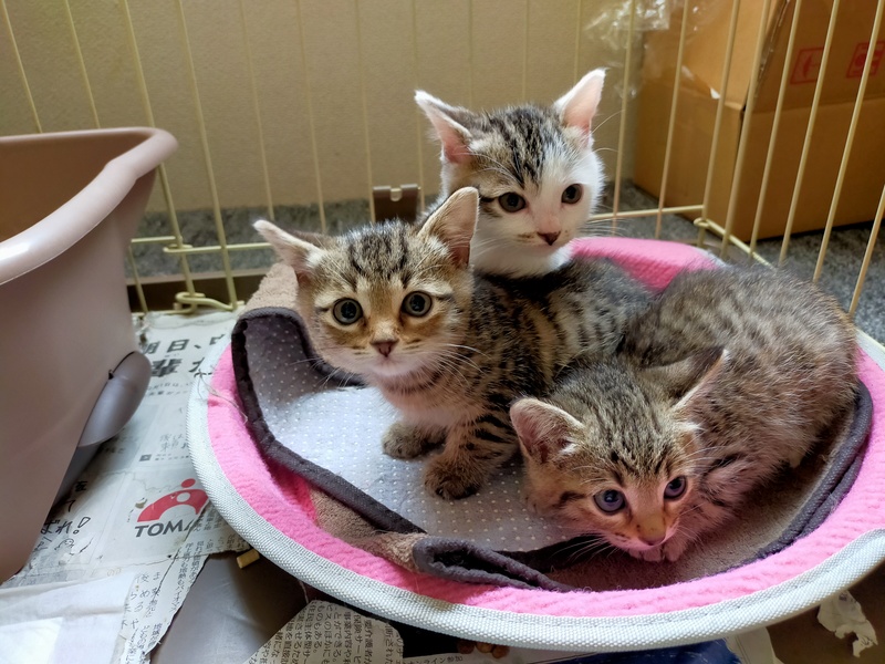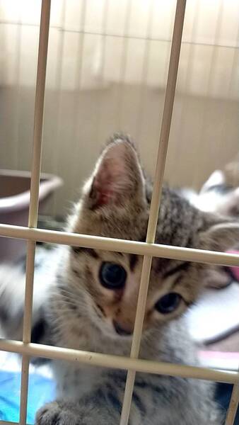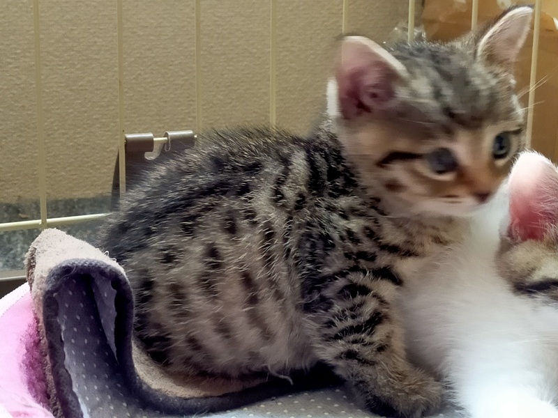 | 特徴(性格など) | キジトラですが、胴体のほうは繋がってない箇所あり、まだら模様でエジプシャンマウに似ています。 性格は遊び好きで活発です。拾い主が仕事であまり構ってやれてないため、そんなにベタベタするほどではありませんが、触っても身は委ねています。預かってもっと人馴れを訓練させる予定です。お顔立ちの整った可愛い子猫で短尾(ボブテイル)です。 |