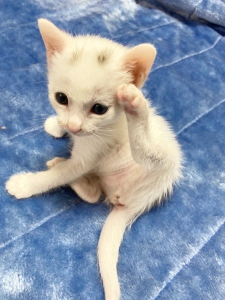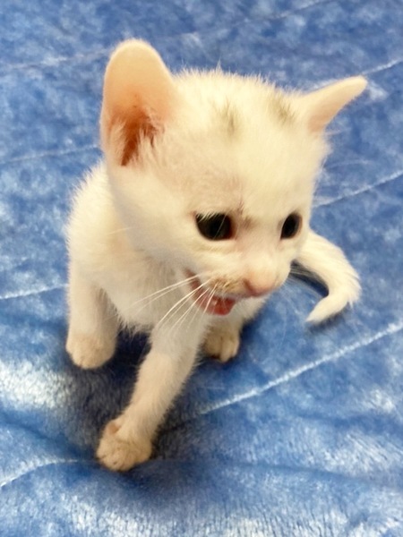 | 特徴(性格など) | ✳︎特徴 全身白猫さんですが、頭の上に小さいキトンキャップをふたつ乗っけているのところがなんといってもチャームポイントです。キトンキャップとは、体を白くする遺伝子が最も優位に働くそうで、生後半年から2歳くらいまでに消えることが多いと言われています。(中には消えずに残る猫さんもいるようです。)頭頂部によく出現するので、帽子に例えてキトンキャップと言われます。消える可能性があるので、小さいうちはたくさんお写真を取っておきたくなります! 尻尾は真っ直ぐです。 ✳︎性格 ドゥエちゃん(仮名) 生後すぐは母猫さんと一緒に過ごしておりましたが、早い段階でボランティアさんに引き取られて授乳もしてもらっているので、ニンゲン=ママになっています。そのためニンゲンが大好きで側に来ると「ゴハンー!」「遊んでー」「抱っこー」とグイグイ近づいてくる勢いの甘えん坊さんです。生まれた時からずっと兄妹や同じ月齢の子猫さん達と一緒に過ごしているので、猫さん同士で遊ぶのも上手になってきました。毎日賑やかです。 これから4ヶ月くらいまでの間は、子猫さんの社会性が育つ時期になります。取っ組み合いの喧嘩をしながら、甘噛みを覚えたり、追いかけっこしながら、動体視力を養っていきます。 できれば、2頭一緒に迎えてくださるお宅や、一緒に遊べる若い先住猫さんがいるお宅、お留守番があまり長くなく猫さんと一緒に遊ぶ時間が十分取れるお宅を優先させていただきたいと考えております。 |