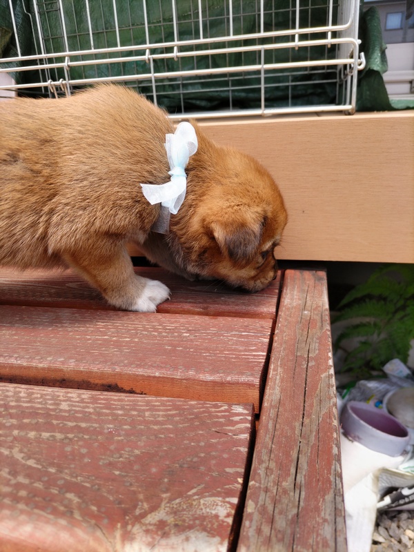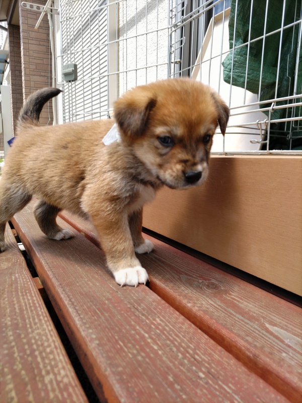 | 特徴(性格など) | こげ茶の男の子です。母犬の体格から成犬時は10~15Kgほどになると予想されます。野犬の子ですから初めは警戒があると思いますが、すぐに慣れて甘えてきます。肺雑音、心雑音などなく健康です(ただし、現時点での健康状態であり、将来的な疾病については一切保証できません)。初期医療として虫下しとノミダニ駆虫薬の投薬を済ませてから譲渡いたします。 | ||