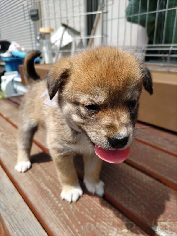 | 特徴(性格など) | こげ茶の女の子です。母犬の体格から成犬時は10~15Kgほどになると予想されます。野犬の子ですから初めは警戒があると思いますが、すぐに慣れて甘えてきます。肺雑音・心雑音ともなく健康です(ただし、現時点での健康状態であって、将来的な疾病については一切保証できません)。初期医療として虫下しとノミダニの駆虫薬投与後譲渡いたします。 | ||