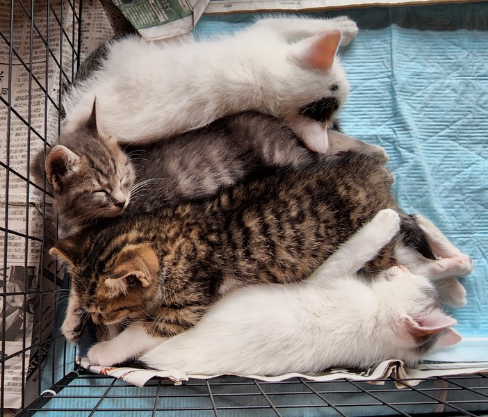 | 特徴(性格など) | ご飯(ふやかした子猫用キャットフード)とトイレ(ペット用トイレシート)問題なくできます。 サバトラ1匹 ぶち猫2匹 人懐っこくて抱っこ爪切りも大丈夫です。 |