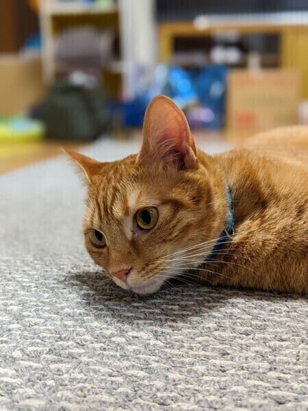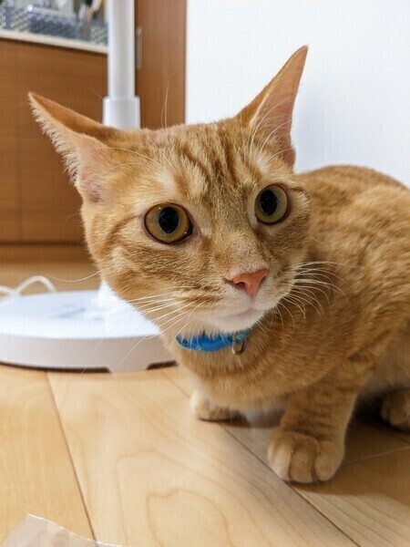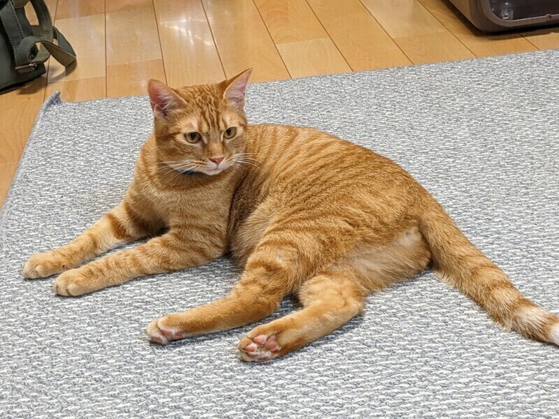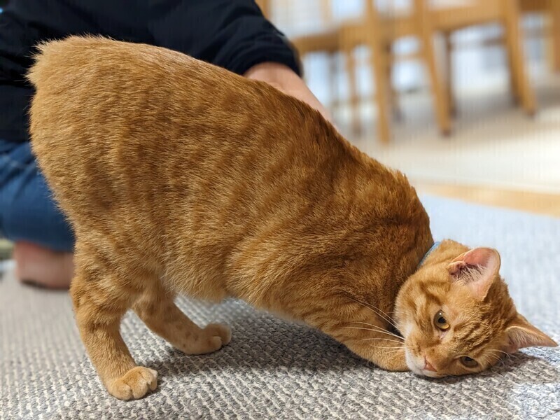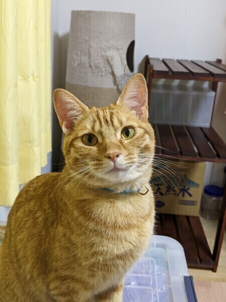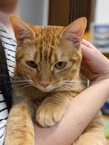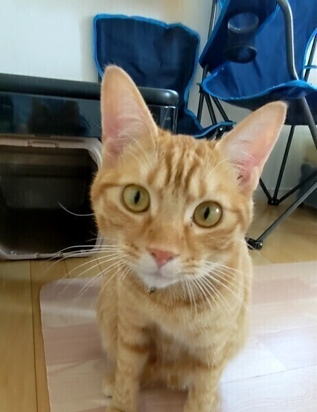| 特徴(性格など) | 2022.8.1(推定) 毛色:茶トラ やんちゃでおっとり茶トラ男子。 一番にすりすりしに来て、撫でて〜くいッと頭を手に当ててきます♡ 歩く足元にもスリスリ。 おもちゃを投げてくわえてちょいちょい上手に遊びます。 首をかしげる姿がめちゃめちゃ可愛い甘えん坊さんです♪ |