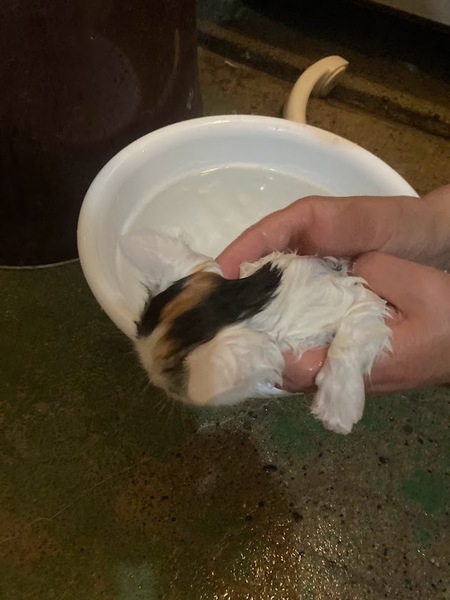 | 特徴(性格など) | 頭に濃い三毛柄と薄い三毛柄の姉妹猫です。 濃い三毛柄はトイレを一番早く憶え、薄い三毛柄は他の子猫たちとよく遊んでいます。 |