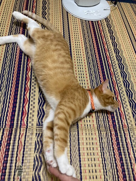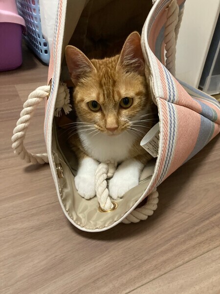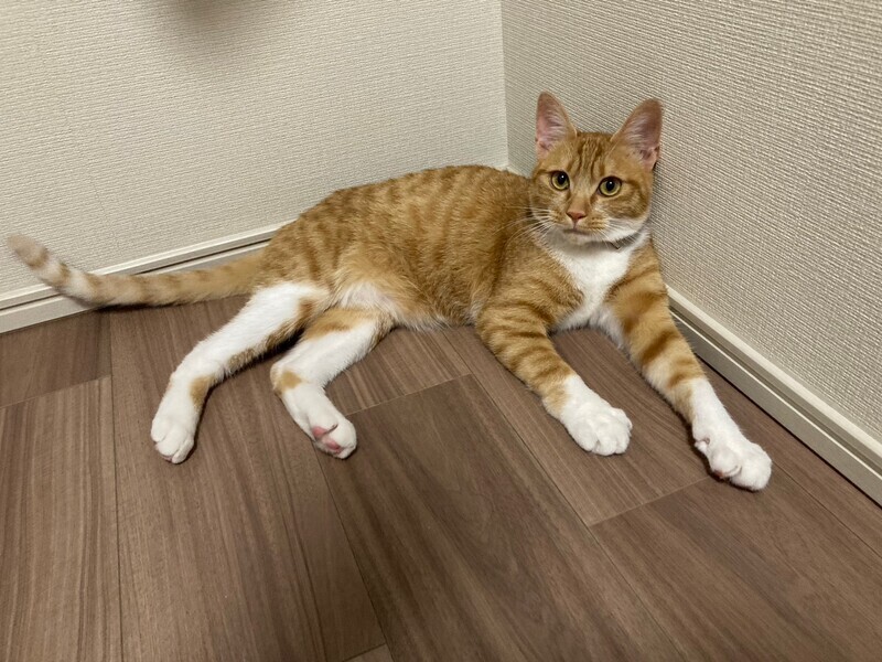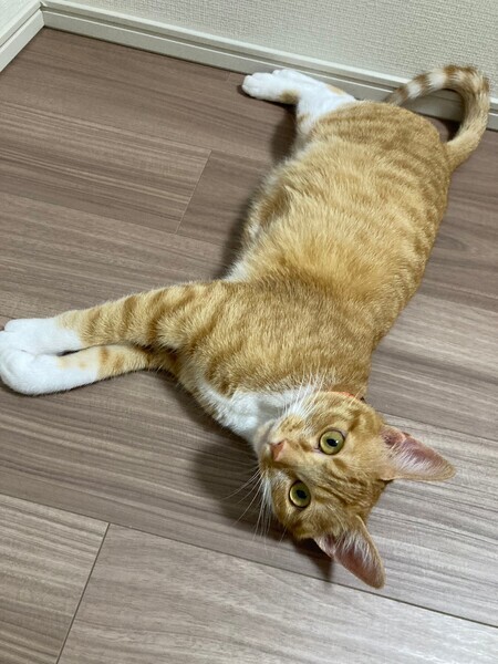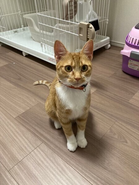 | 特徴(性格など) | 2022.8.1(推定) 毛色:茶白 しっぽの細長い茶白の男の子。 まんまるな目と白い靴下がチャームポイント☆ 人懐っこく、すりすりゴロゴロな甘えん坊です♡ 好奇心旺盛ですが、ビビりな一面も。 食べる事もだ~い好きで、お腹が空くと鳴いて教えてくれます。 |