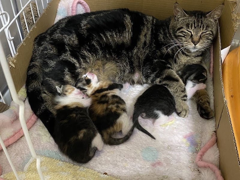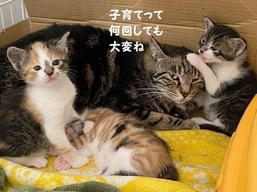 | 里親募集する理由 | 母猫は、なかなか捕獲機に入らず何度も妊娠出産を繰り返してきました。 ようやく保護できた時には妊娠後期でした。 預かりさん宅で4月17日、3匹の子猫を出産し、ただいま子育て中です。 兄妹一緒か母猫と一緒に迎えてくださる方を希望しています。 先住猫さんがいらっしゃる場合は、離乳後、母猫だけで迎えてくださる方も募集しています |