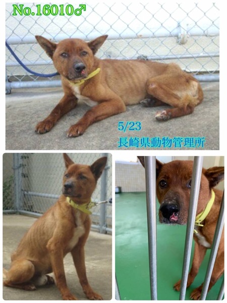| 里親募集する理由 | ♡やや大きめの中型、ピン!と立ち耳のとっても可愛い性格花丸な男の子ฅ•ﻌ•ฅ 可哀想に現在ガリガリに痩せて肋骨が浮き出ています( ; ; ) 見た目の推定になりますがまだ若そうで5歳前後位?体重は15キロ有るか無いか位、標準体重になれば18キロ〜位になるかと思われますฅ•ﻌ•ฅ 寂しく助けを待っています! 訳も分からず突然連れて来られてどんなに寂しく心細いか。一日も早く温かい家庭の中で過ごさせてあげたいです。 ⭐️県外、遠方の方でも譲渡の条件が合い、良縁に恵まれましたら里親になっていただけますのでどうぞ宜しくお願い致します! ※ ※長くなりますが犬猫と里親様の幸せの為にも、募集内容を熟読し、必ずご家族とよく相談をされた上、ご家族全員の賛同を得られてからのお問い合わせ をお願い申し上げます。 ⭐️外飼いでは無く、室内飼育で家族の一員として迎えて下さる方、「引き渡し方法」のところにあります【①〜のアンケート】にご回答と共にお問い合わせをいただけますよう、お願い申し上げますm(_ _)m 長崎県西彼杵郡長与町内にて彷徨っていたところを5/23に保護され保健所収容、飼主の迎えは無く現在は長崎県動物管理所へ移送されてきています。 数ヶ月前から広範囲(大草〜琴ノ尾岳近辺)での徘徊、移動を目撃されていたようです。 寒さや空腹、雨風にも苦しんできたことでしょう( ; ; )何処でどう怪我をしたのか鼻の左下、左後肢の先など、あちこち傷だらけでした。(収容当初はかなり湿潤し赤くなっていましたが現在は改善傾向にあります) その後は初めての知らない場所に収容されてずっと不安で寂しいと思います。。 今までどう生きてきたのか知る由もありませんが( ; ; )とても人懐こくて無邪気な愛嬌抜群の性格花丸君です♡ フレンドリーで誰が何処を触っても大丈夫。 尻尾フリフリで撫でて〜と擦り寄って甘えてきて本当に可愛いです(^^) 男の子の他犬がお散歩に行く時などは吠えますが子犬に対しては吠えません、とにかく人が好きで無理もありませんが、寂しくてかまってほしくて、こっちに来てよ〜と人を呼んで吠えたりします。それと、これだけ痩せて飢えに苦しんできたからでしょう、ご飯の時は勢いよくがっついて器に顔を埋めるように食べています( ; ; )おやつをあげる時もバクッと指まで一緒に食べるような勢いがあります(^^;; ◎今は毎日2回、栄養バッチリの高品質なプレミアムフードのカナガンとデビフ缶詰を食べています。 綺麗にブラッシング、シャンプーをして栄養をつけたらもっと凛々しい美犬クンになる事でしょう(^O^)/ 優しい職員さん方が怖くないよ、今度こそは幸せになれます様にと毎日触れ合いながら、一生懸命にお世話してくださっています。 職員さんが連れ出してくれるお散歩も、嬉しくて楽しそう♪力もあり出だしはグイグイと引っ張りますが興奮がおさまれば段々と落ち着いてお散歩出来ます。 ※ですが、急な物音や知らない場所にビックリして怖がって、咄嗟に逃げようとする可能性も大いにあり得る事だと思いますし、その時の力、引きの強さも想定し、突然の走り出しや高い塀や壁・柵の飛び越え・急な方向転換や首を振って後退りからの首輪抜け、胴輪抜けにはご用心です!! まだ呼び戻しも覚えていないので、もし逃がしてしまったらピューっと走って行ってしまうタイプかもしれません!(>_<) もし逃がしたらもう捕まえられない!というようにお考えくださいm(_ _)m ※繰り返しになりますがどんな子であっても、慣れてきても、常に、脱走・逃走には充分な注意と最大限の配慮をお願いしております! この子のペースや体力をみながら、躾や毎日朝晩のお散歩、トイレなど必要な運動の時間をしっかり取ることの出来るご家庭、 譲渡後には早急な病院受診が可能なご家庭を希望しておりますm(_ _)m 捨てられたのでしょうか、迷子でしょうか。 何故ここに居なければならないのでしょう。 人間よりはるかに短い犬生なのに。 何故大切な家族を直ぐに探さないのか、 何故最後の時まで愛せないのでしょうか… 保護時、首輪や胴輪は何も付いていませんでした。 (写真の首輪は管理所でつけたものです) 可哀想に、家族の元へ帰りたい、でも収容されたら帰れません。 言葉を持たない大事な家族を守る為に首輪、胴輪に迷子札・鑑札を必ずつけて頂きたい、そして、ずっとこんな悲しい状況のままでいたより保護されて良かった!と考え、この子に幸せを、温かい本当の本物の家族を見つけたいと願っております⭐︎⭐︎ 人間が焦らずにゆっくり見守りながら、愛情を持って接し、しっかりとお散歩にも連れ出して行けば、この子はきっと新しい家庭に馴染んでいけると、本当は思い切り甘えて目一杯遊んでほしいのだと思います。 辛かった過去があるという点も踏まえ、人は怖くないんだよと、ずっと人を信じてくれる様に、広い心でドンとこい^_^と仰って頂ける方、この子をこの先も尻尾フリフリ♪で、ニコニ