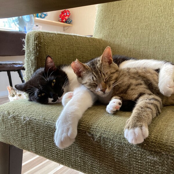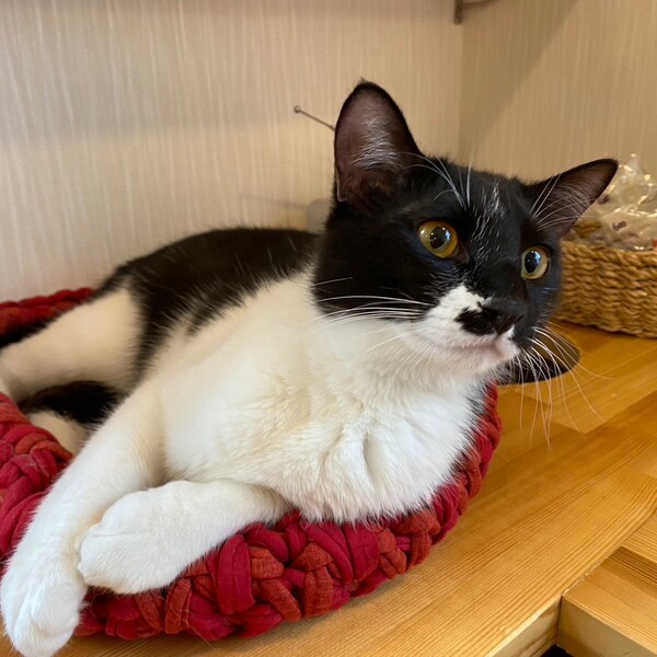 | 特徴(性格など) | おヒゲがユニークな白黒猫。 元気もりもりご飯ももりもり。おかげでもっちりボディです。 運動量多め、声が大きめ。 |