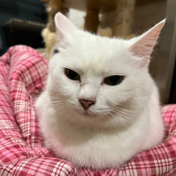 | 特徴(性格など) | おっとりしていて人が大好き、スリスリのとっても甘えん坊さんです。 真っ白で尻尾はちょっと短かめな半長毛の美人さん。 もふもふで雪見だいふくのような女の子。 他の猫とベタベタはしませんが、大きな喧嘩もなく過ごしています。 不妊手術済み、ウイルス検査(猫エイズ・猫白血病)陰性、便検査、ノミ・ダニ・内部寄生虫駆除、三種混合ワクチン接種、マイクロチップ装着 |