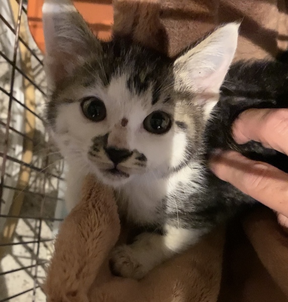 | 特徴(性格など) | お顔は白で頭とお口周りはしま模様。 体は全体的に黒のしま模様。 甘えん坊でわんぱくな子猫です。 |
