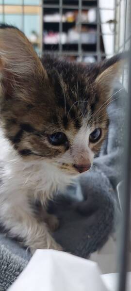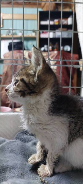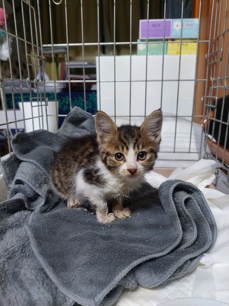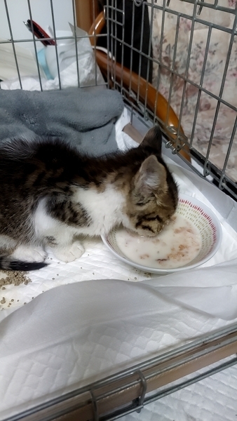 | 特徴(性格など) | 黒キジ☓白です。 元気に走り回り、ご飯もよく食べています。 かわいいです。 うちの先住猫とも思ったより早く仲良くなりました。 なでなでは大好き、抱っこはちょっと苦手ですが、ご機嫌な子です。 食事は、まだミルクは飲んでいますが、離乳食よりは猫缶が好きです。 かりかりは練習中ですが、ふやかせば食べます。 そのままは、現状ではあまりお好みではないようです。 |