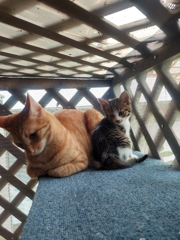 | 里親募集する理由 | 職場の子が拾いましたが、母親が猫アレルギーで飼えないとのことで預かりました。 すでに我が家も5匹の猫がおり、飼うことができません。 写真の茶色の子はうちの先住猫で、現在のちびさんのお世話係です。 |