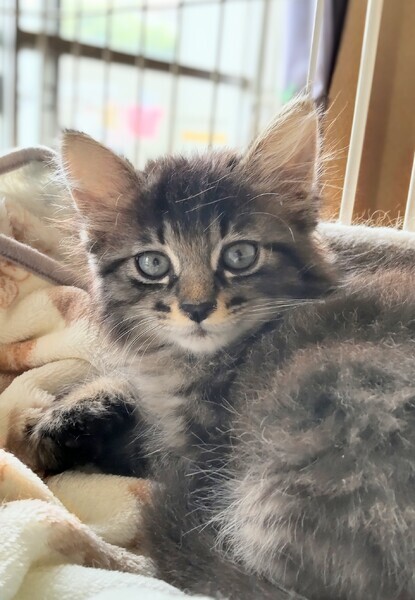 | 特徴(性格など) | キジトラ男子 ふわふわ毛並みの長毛風 元気いっぱいで兄弟猫たちと遊んでいます |